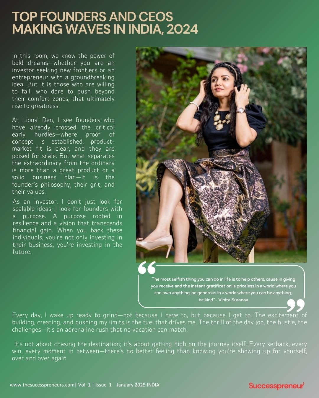 Subscribe to Vinita Surana’s newsletter for insights on entrepreneurship, investments, leadership, and personal growth. Gain valuable lessons from her journey, industry trends, and exclusive updates to navigate the ever-evolving business landscape.